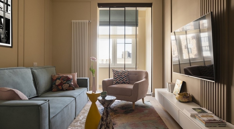 В каждом комнате присутствует любимый сине-голубой цвет владельцев. Он и объединяет всю квартиру. В кухне наиболее чистые и яркие цвета: белый, серый. Для акцента использовали черный, синий. Цвет темного дерева на стене отделяет зону отдыха, но повторяется в отделке внутренней части стеклянного шкафа. В спальне спокойная палитра, располагающая ко сну. Бежевый цвет стен и пол ассоциируется с песочным пляжем. В гостиной цвета самые насыщенные и теплые: охра, коричневый, бирюзовый, желтый. Акцентное розовое кресло появилось спонтанно и очень понравилось хозяйке. Поддержали его розовыми подушками и ковром.