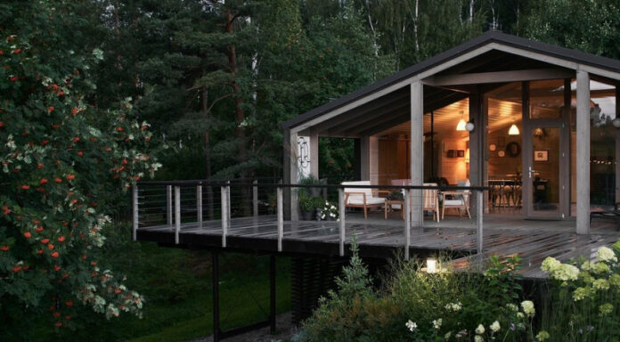 По форме домик вытянутый и напоминает вагон, при этом вход есть с двух сторон очень удобно. Несмотря на то, что окна достаточно большие, в отделке использовали много полупрозрачных элементов так света внутри становится еще больше.