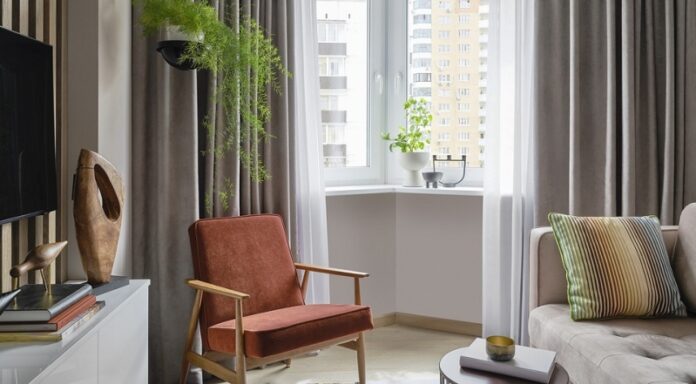 Расслабляющая атмосфера гостиной создана с помощью спокойных, припыленных, нюансных оттенков и растительных мотивов фрески. Она на основе рисунка. Особенность векторной графики возможность масштабирования без потери качества. Напольное покрытие, плинтусы, элементы мебели и аксессуары из натурального дерева, а также комнатные растения гармонично дополняют экологически ориентированный интерьер. Индивидуальность вносят детали: ковер с цветовыми акцентами в гостиной, яркий плед и декоративные подушки с принтом «шеврон».
