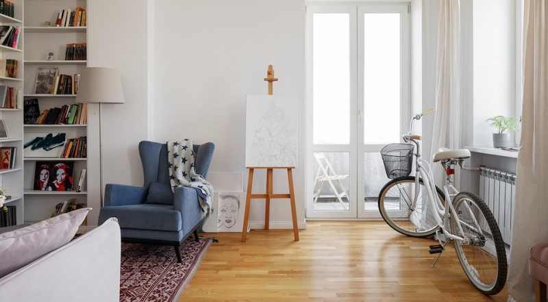 Внешнее слияние архитектуры конструктивизма и классицизма дома обусловило стилистику и дальнейший вектор развития основных мотивов интерьера. В проекте квартиры также чувствуется влияние французских интерьеров начала 20 века. Заказчица — креативная девушка-художник — участвовала во всех процессах проектирования, ремонта и декорирования. Яркие и индивидуальные предметы, расположенные в каждом помещении квартиры, отображают ее основные увлечения — проигрыватель винила, мольберт, отдельно стоящий винтажный велосипед.