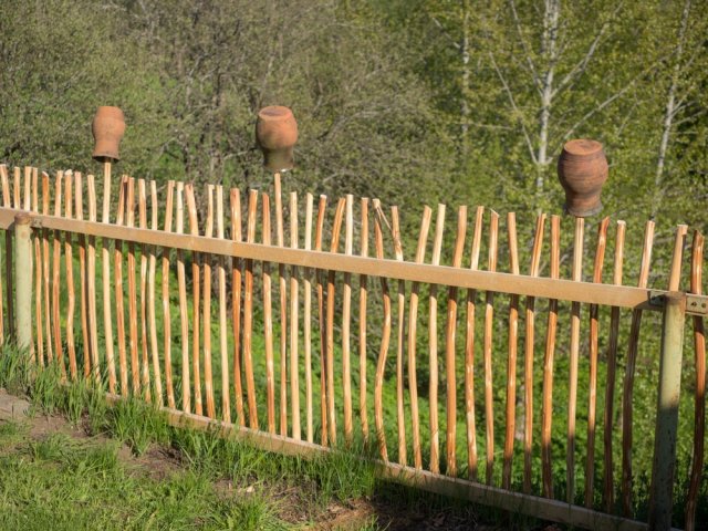Для изготовления подобного ограждения подберите ветки примерно равного диаметра и распилите их на отрезки одинаковой длины. Затем соедините подготовленные ветки плотной веревкой или проволокой либо прибейте к поперечной перекладине. По периметру грядки или участка, который вы хотите отделить, вкопайте опорные столбики и прибейте (или привяжите) к ним сделанное ограждение.