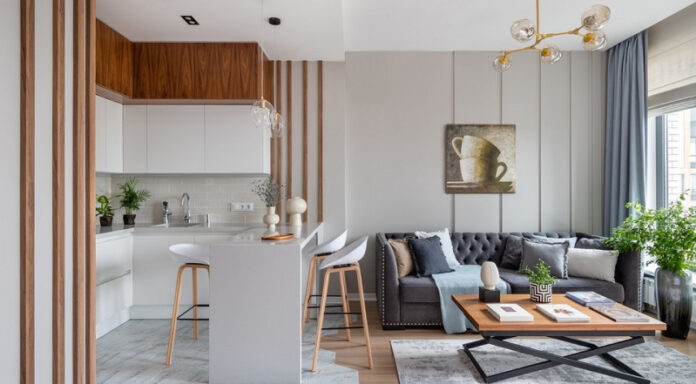 Современный минимализм может быть уютным, доказывает этот проект. Секрет в разнообразных фактурах, натуральных материалах и теплых природных оттенков. В этой кухне-гостиной 20 кв. м с диваном главную роль играют дерево (или его качественные имитации) и различные мягкие ткани. Сочетание коричневого, белого и серого беспроигрышное, особенно если окна выходят на север или северо-запад.