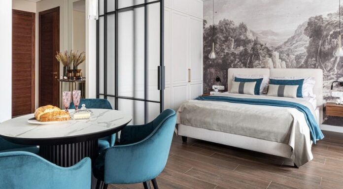 Дизайнер Анастасия Григорьева спланировала пространство так, чтобы уместить все нужные функциональные зоны. Интерьер получился с элементами современного шика латунью, мрамором, деревянными панелями и высокими дверями.