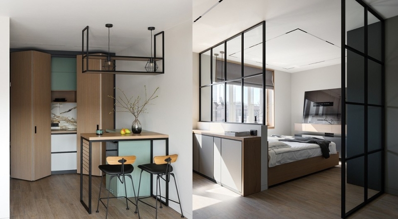 Квартира была евродвушкой. Так называют планировки, где есть кухня-гостиная и небольшая изолированная спальня. В этом случае были еще и раздельные ванная с санузлом. Так как заказчик живет один, решили оформить студийное пространство. Перегородки между кухней-гостиной и комнатой разобрали. Заменили их на стеклянные перегородки с черным профилем. Таким образом солнечный свет попадает даже в прихожую.