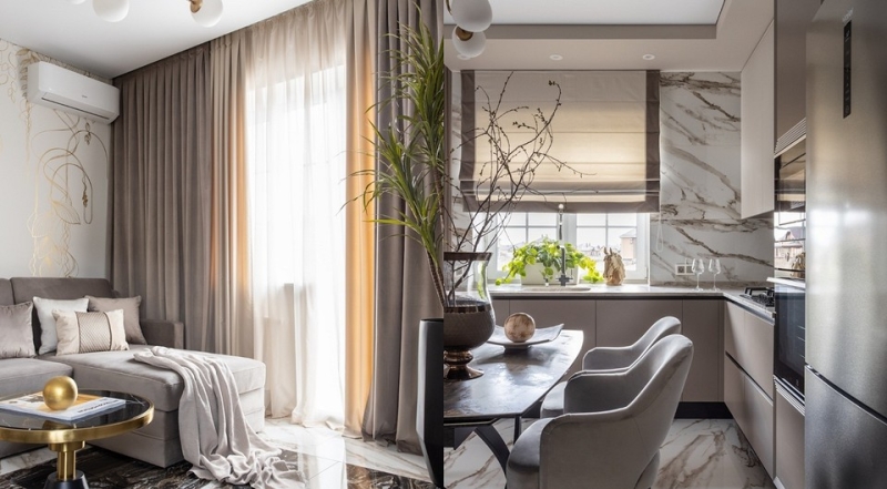 Для пола в комнатах выбрали ламинат практично, красиво и недорого. В кухне-гостиной крупноформатный керамогранит под мрамор. Скомбинировали светлый и темный материал, глянцевый финиш выглядит шикарно и добавляет роскоши пространству.