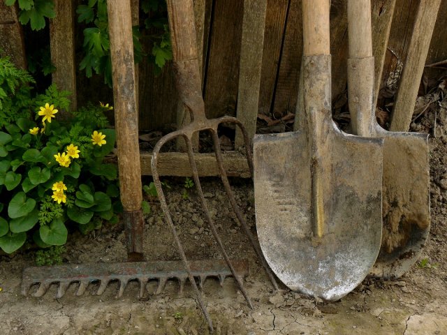 Крупные инструменты – вилы, лопаты, грабли и т.д. – моют обычно в конце сезона. Для этого подготовьте таз с водой, добавьте в него несколько ложек перманганата калия, пока раствор не приобретет насыщенный малиновый цвет, и аккуратно вымойте весь инвентарь с помощью губки или тряпки. Лучше это делать в перчатках. Затем инструменты просушите и сложите на хранение.