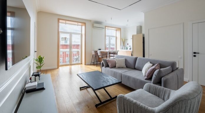 Мебель простых форм. Для общей зоны выбрали многофункциональный стол-трансформер, который в сложенном виде представляет собой маленький журнальный столик, а в разложенном превращается в полноценный обеденный. Удобно для приема гостей.