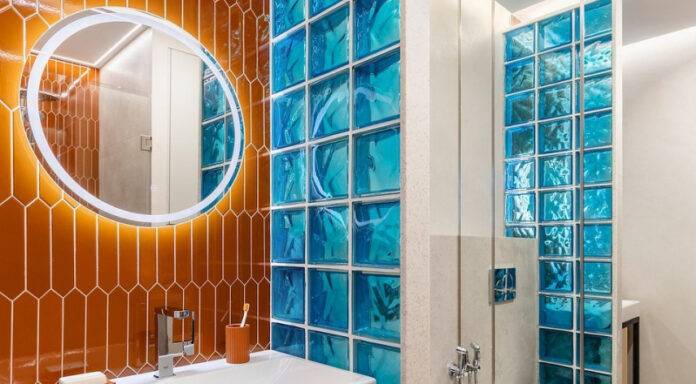 Это могут быть как оригинальные материалы (например, раковина из камня или слэбы мрамора на стене), так и их качественные имитации. В магазинах можно найти плитку или керамогранит под дерево, камень, мрамор, а фактуру бетона или кирпича передать влагостойкой декоративной штукатуркой.