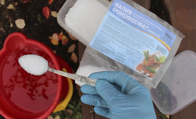 Осенью очень важно обеспечить все многолетние растения и корнеплоды, предназначенные для длительного хранения, достаточным количеством калия и фосфора. Для осенней корневой подкормки плодовых деревьев, декоративных и ягодных кустарников используют 0,1%-ный водный раствор монофосфата калия (10 л на 1 кв.м земли). Корневую подкормку проводят по влажной почве, поле дождя или полива.