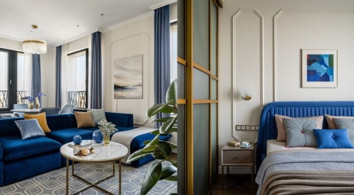 Мягкая мебель подобрана в глубоких синих оттенках обивка дивана в гостиной, кровати в спальне, барных стульев. Обеденные стулья в нежно-голубой обивке. Оттенки синего выбраны в качестве акцента как параллель с морем и небом.