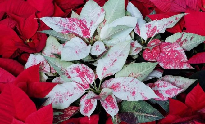 Sonora White Glitter – прицветные листья имеют алую окраску, «забрызганную» белыми неровными пятнышками.
