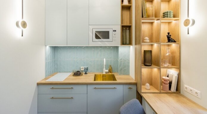 Кухонный гарнитур компактный. Здесь разместили шкафчики для хранения, в верхний шкаф встроили микроволновку, а на столешнице установили варочную панель на две конфорки.