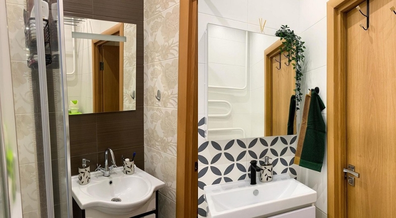 Хозяйка этой квартиры тоже решилась на перекраску ванной комнаты. Раньше здесь была скомбинирована розовая и светлая плитка, а также керамический декор. После обновления ванная комната стала полностью белой. Кроме этого, заменили напольную раковину на подвесную тумбу с раковиной, обновили зеркало, добавили хранения в зоне над унитазом. А еще дверь получила новый цвет тоже светлый. Выглядит отлично!