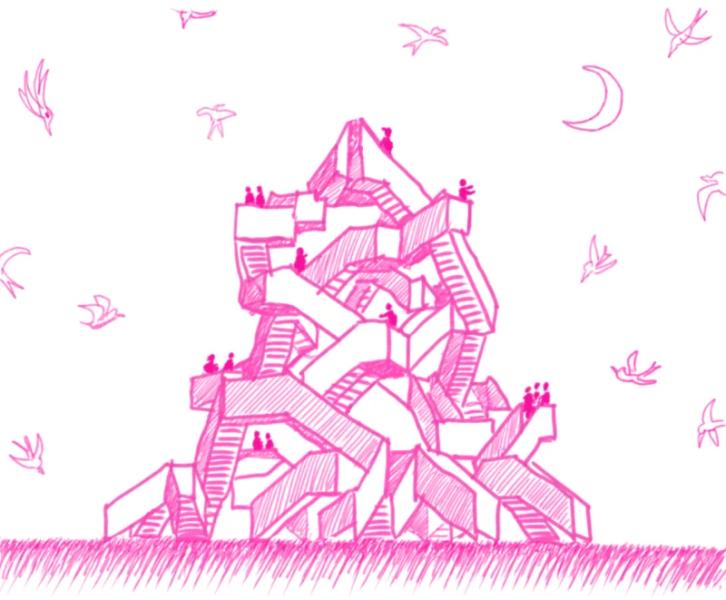 Лестницы запутались и переплелись. Конструкция представляет собой лабиринт, в котором каждый поворот может подарить остановку для размышлений, встречу с собой, с другими, с окружающей природой. Арт-объект полон парадоксов: при кажущихся легкости и простоте архитектурный принцип глубоко иррационален – выбрана ломаная надрывная форма, схожая со структурой химических соединений. Абсурд заложенных противоречий подчеркнут розовым – цветом радостной наивности и детской открытости миру, с которой автор призывает нас подступать к сложному и непонятному окружающему.