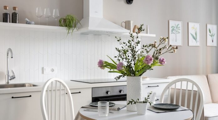 На полу кварцвиниловая плитка. Это прочный и износостойкий материал, который можно укладывать даже на кухне и в прихожей. Поэтому его часто выбирают дизайнеры для квартир под сдачу в аренду и не только.