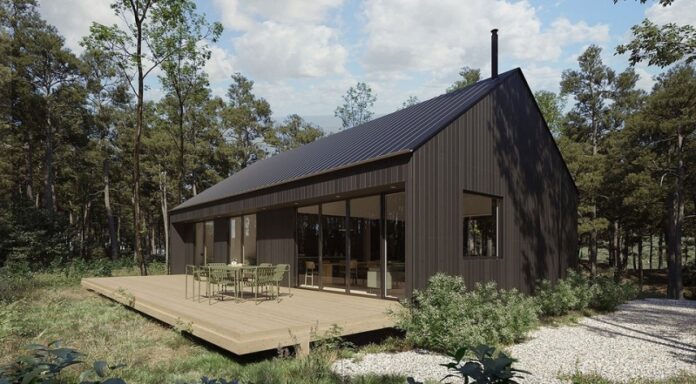 Проект типовой, с возможностью выбора цветовой схемы: светлые или темные фасады и, соответственно, светлый или темный интерьер. Комбинировать можно любым образом. Жилье рассчитано на 2-4 человека, внутри выделена просторная общая зона с линейным кухонным гарнитуром, столовой и мягкой группами. Спальня изолированная, рядом находятся санузел и отдельный домашний кабинет. Перед входом большая открытая терраса, представляющая собой деревянный настил. Ее можно обустроить под свои нужды: поставить стол для трапез на свежем воздухе, шезлонги, чтобы загорать на солнце, или, например, сделать спортивный уголок. На фото ниже экстерьер одноэтажного дома с террасой.