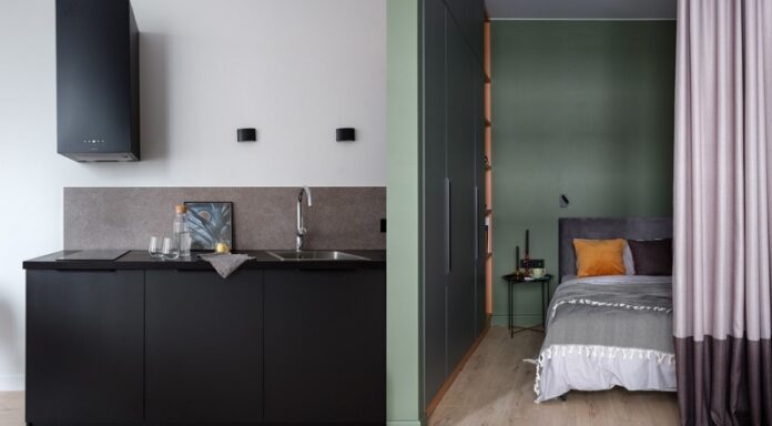 Дизайнер сделала ставку на качественные и долговечные материалы. Обычно в квартирах под сдачу поступают иначе, но тут преследовали другую цель. Тем не менее в бюджет нужно было уложиться. Для стен выбрали краску. Кухня и гостиная окрашены в нейтральный серый цвет. Прихожая и спальня в глубокий зеленый. Это позволило сделать пространство интереснее, а еще, как ни странно, расширить эти маленькие помещения. Глубокие цвета дают именно такой эффект.