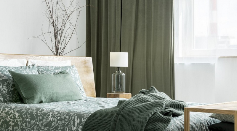 Если комната оформлена в монохромной гамме (например, на основе бежевого или серого), разбавьте такую палитру зеленым постельным бельем или шторами. Дополнительно смягчит обстановку спальни теплая и уютная фактура дерева.