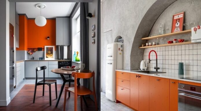 Если апельсиновая палитра нужна только для оживления монотонного интерьера, то хватит нескольких крупных предметов: это может быть не только мебель, но и большеразмерная техника. Если принято решение делать в дерзкой расцветке кухонные шкафы, то, чтобы избежать перегруженности интерьера, в морковный можно оформить только несколько из них, дополнив более нейтральными красками.