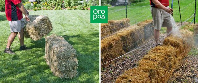 Проволочную или веревочную обвязку с тюков соломы при обустройстве соломенных грядок снимать не нужно – она позволит сохранить форму тючкам, когда солома начнет разрушаться.