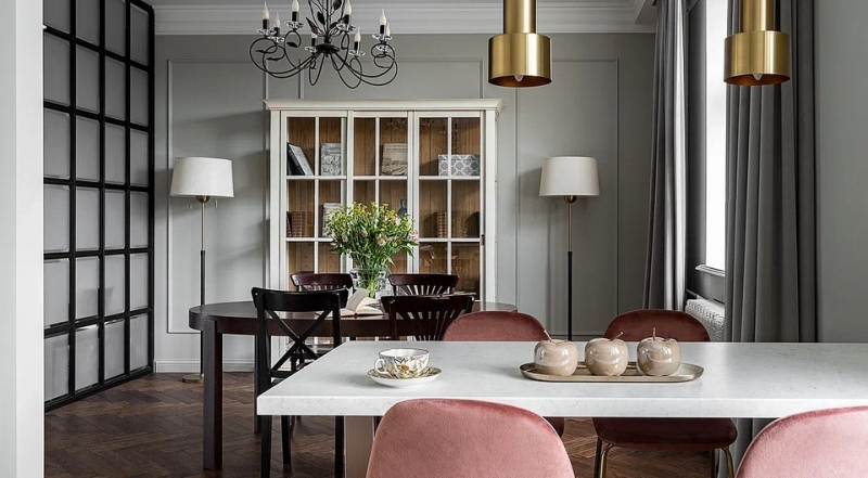У хозяев квартиры было несколько винтажных вещей, которые нашли свое место в интерьере. Хозяйке принадлежали три настоящих венских стула компании Thonet дизайн этих стульев разработали еще в середине XIX века. Они заняли свое место в столовой дизайнер дополнила комплект одним стулом от ИКЕА.