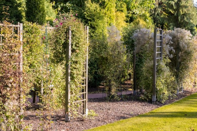 Пергола-ширма, или шпалера, чаще всего используется для зонирования сада, также она поможет задекорировать неприглядный угол участка или укрыть посадки от сильных порывов ветра. Такой перголой удобно отделять парадную зону от хозяйственной, а можно укрыться за ней от посторонних взглядов, поставив на границе участка.
