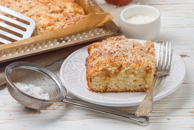 Извлеките противень из духовки, нарежьте пирог на порции и украсьте сахарной пудрой.
