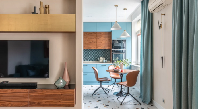 Чтобы сделать небольшое пространство визуально более просторным, за основу взяли скандинавский стиль. Основа палитры фоновый белый цвет, а его дополняют яркие оттенки: зеленый, солнечно-желтый, фиолетовый, бирюзовый. Вся мебель простых форм, но более уютным жилье делают природные материалы и фактуры.