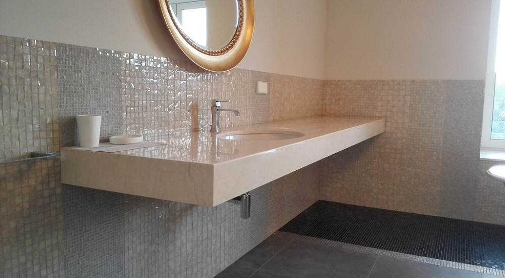 Если говорить о натуральном камне, к примеру, гранит, то стоит отметить, что этот материал имеет хорошую устойчивость к повышенной температуре. Но и важно учитывать то, что в ванной комнате не понадобиться такой материал, так как в этом помещении нет сильно нагретых предметов. Поэтому агломерат отлично подходит для ванной комнаты. Этот материал может быть хорошей альтернативой граниту или мрамору.