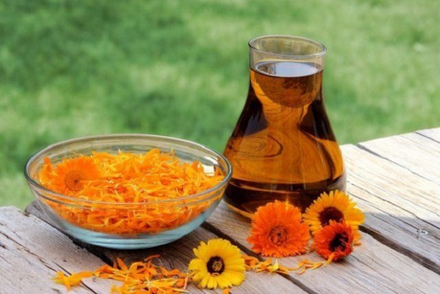А масляной экстракт с календулой поможет дополнительно оздоровить и кожу головы. Приготовить его нетрудно – стеклянную емкость до верха заполняют цветками ноготков и заливают оливковым маслом. Спустя две недели смесь настоится, и вы получите самое целебное масло с календулой.