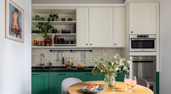 У этого интерьера нет четко выраженного стиля, это эклектика: у нас классический гипсовый молдинг на стене, рядом минималистичный фанерный стеллаж, и они прекрасно дружат. Основной задачей для своих интерьеров я ставлю создание вневременного уютного дома. Поэтому часто использую классические элементы — молдинг, плинтус, классические двери, аккуратный, но все же классический наличник. Все это создает базу, как если бы интерьер достался в наследство, такое родовое гнездо. И дальше мы уже смело можем добавлять современные предметы, как, например, стол на кухне молодого российского бренда. Или всем известную ИКЕА. Дело лишь в пропорциях и балансе.