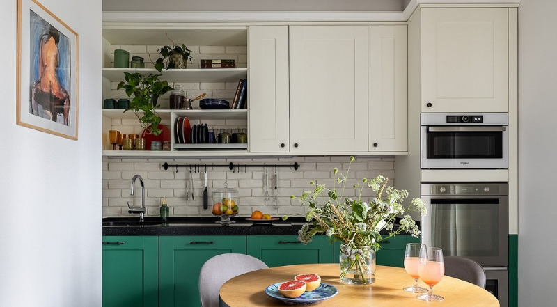 «При подборе и изготовлении предметов мебели в первую очередь я учитывала функцию. Как, например, стеллаж и встроенные гардеробные системы они получились супервместительными и смогли закрыть абсолютно все потребности заказчиков по хранению. По стилю это некий микс классики (кухонные фасады, например) и современные формы (кухонный стол, ТВ тумба)», рассказывает Анна.