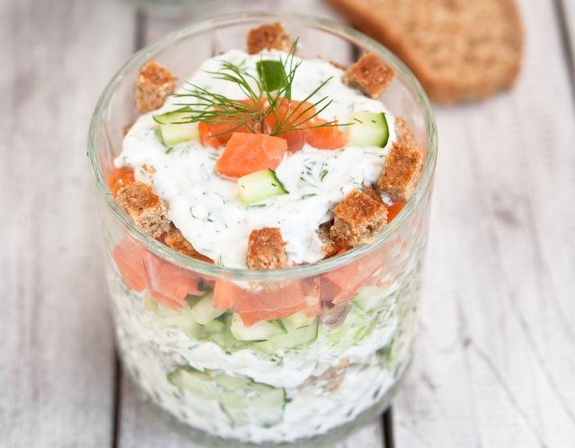 Вам понадобятся: 200 г слабосоленого лосося или семги, 450 г простого греческого йогурта, 1 большой огурец, 2 ч.л. укропа, 0,5 ч.л. соли, сухарики из хлеба для украшения.