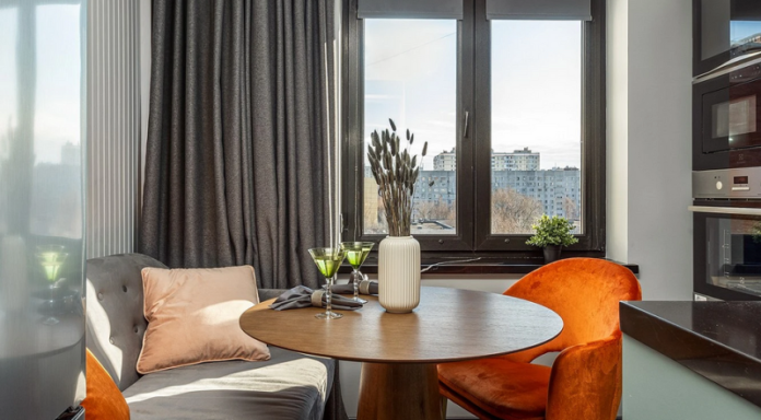 Главное в приеме гостей на кухне комфортная столовая зона. Если на нее и большую зону готовки не хватает общей площади, при этом вы не слишком много готовите, можно смело пересмотреть размер гарнитура. Оцените, необходим ли он вам в том объеме, в котором вы планировали его изначально. Возможно, можно отказаться от пары секций или заменить часть техники на более компактную (например, выбрать вместо четырехконфорочной панели мини-плиту на две конфорки).