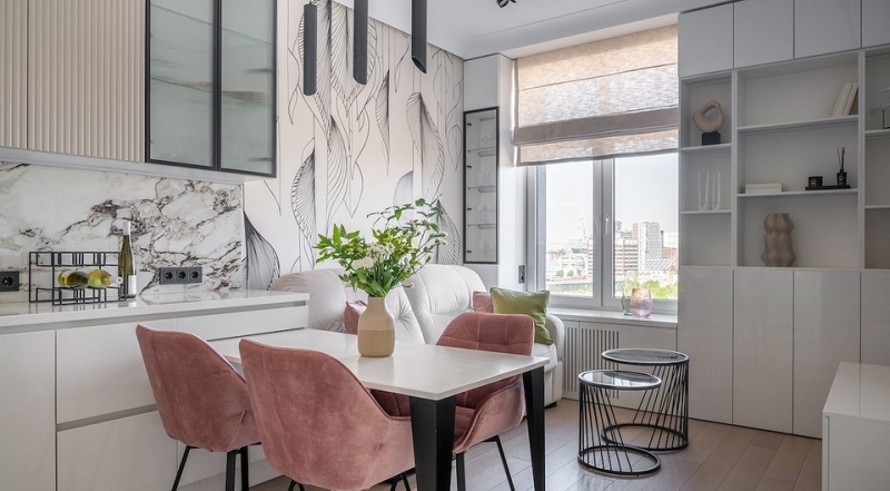 Благодаря перепланировке дизайнер выделила в спальне гардеробную, отделенную распашными двойными дверями с расстекловкой. В прихожей также удалось организовать маленькую кладовку для хранения разного хозяйственного инвентаря. Кроме этого, у входа есть вместительный встроенный шкаф с открытой секцией, где сделана банкетка. Этот шкаф переход в кухонный гарнитур. Он выполнен в угловой планировке с белыми глянцевыми фасадами и верхним рядом шкафов-антресолей. Второй ряд шкафов с фрезеровкой. Для него подобрали бежевый цвет, который сочетается с прожилками на керамограните. Обеденный стол примыкает к гарнитуру.