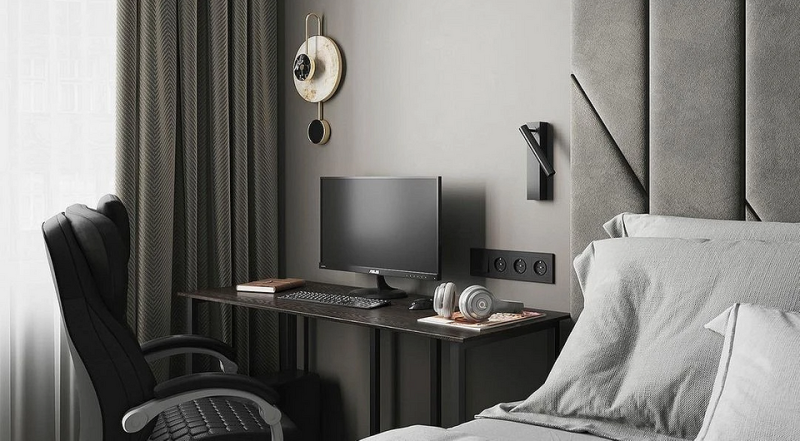 Минимальный необходимый набор место для чтения, письма или работы, удобный стул и хотя бы одна небольшая система хранения. Если у вас стационарный компьютер с системным блоком или два монитора, тогда точно понадобится достаточно широкий и высокий письменный стол. Для ноутбука же хватит и небольшой столешницы. Можно даже заменить классическую модель туалетным столиком, трюмо со свободной поверхностью или использовать для этих целей подоконник. Если места очень мало, хороший вариант складная столешница, которая крепится к стене. Такое решение подойдет для небольшой лоджии или спальни, где нужно оставить свободный проход.