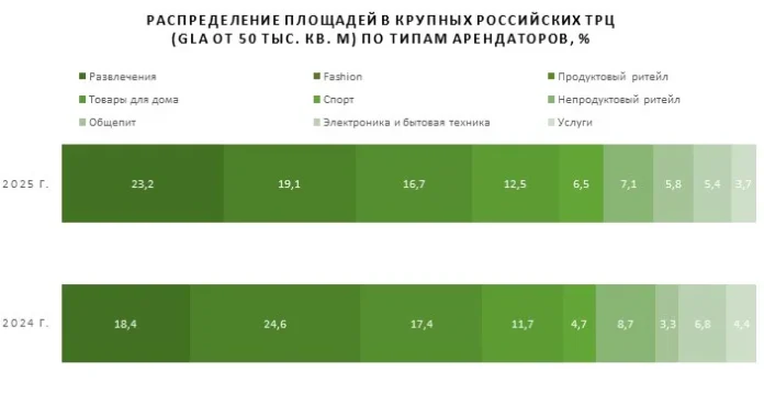 В пресс-службе отметили, что в докризисном 2019 году магазины одежды, обуви, аксессуаров и брендовой бижутерии закрывали от 52% до 56% всех арендопригодных площадей. Однако чередующиеся экономические потрясения снизили их присутствие в сегменте до уровня менее четверти всех коммерческих помещений — 24,6%, а к концу 2025 года этот показатель сократился еще на 5,5%.