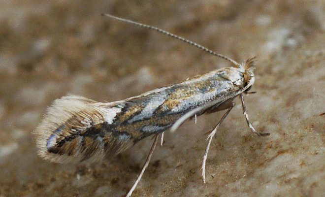 Внешне это мелкая (длиной не более 8,5 мм) узкокрылая бабочка серовато-бурого цвета с белыми поперечными полосками на передних крыльях и длинной бахромой на задних. В течение года развивается 1-2 поколения вредителя. Бабочки питаются цветочным нектаром и начинают лет уже при температуре воздуха около 9°C, примерно в мае-июне, во время цветения яблони и рябины, яйца по одному откладывают на формирующиеся завязи у основания, между высохшими тычинками цветков. Бабочки активны, как правило, с 8-9 часов вечера, а в дневное время они прячутся в листьях деревьев. Одна самка за свою жизнь откладывает 30-80 светло-рыжих мелких яиц на протяжении 5-6 недель.