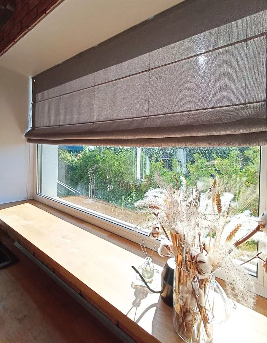 - панорамные окна, для них римские шторы идеально подойдут. Если собрать их не полностью, то верхняя часть окна будет закрыта, так не будет создаваться ощущение “аквариума”, о котором часто говорят обладатели панорамных окон;