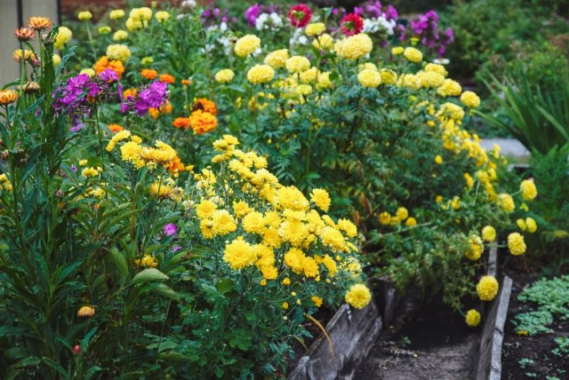 А если вам не по душе темные или контрастные сочетания, можете сотворить настоящий солнечный миксбордер, посадив желтоцветковые хризантемы в компанию к туям, можжевельникам и кипарисовикам с золотистой хвоей. Но помните, что самый яркий оттенок хвои и роскошное цветение хризантем вы получите лишь на участке с обилием солнечного света.