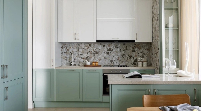 Чтобы рабочая поверхность гармонировала с остальным интерьером, можно подобрать ее в том же оттенке, что и отделку. Проще всего, когда стены выкрашены в какой-либо нейтральный цвет: серый, белый, бежевый или черный. Под них не составит труда найти материал для столешницы. Если окрашивание сложное и состоит из нескольких оттенков (либо стены оклеены обоями), столешница может копировать только один из представленных цветов.