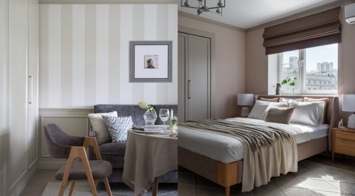 В спальне обои с легким, почти незаметным геометрическим рисунком. Основной цвет бежевый с оттенками красного, теплый и обволакивающий. На полу в обеих зонах инженерная доска, уложенная елочкой. Плинтусы и потолочные карнизы покрасили в цвет стен. Это визуально увеличивает высоту потолков.