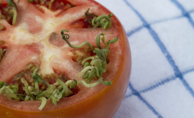 Если семечки помидора проросли прямо внутри плода, удалите их, а сочные «стенки» томата используйте в вашем любимом кулинарном рецепте. Проростки можете не выбрасывать, а использовать в качестве рассады – самые крепкие ростки с большими листочками посадите в грунт или в торфяные таблетки.