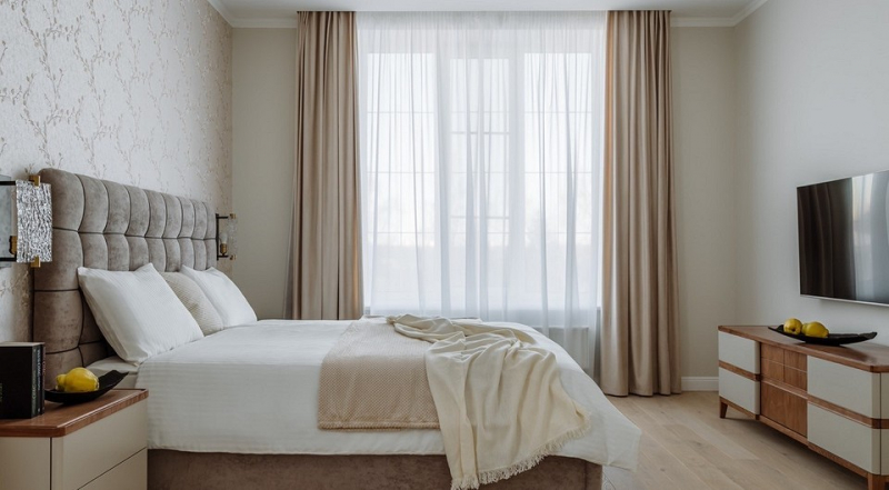 В спальне, как правило, вешают достаточно плотные портьеры. Для их пошива можно использовать разные виды тканей. Какие материалы штор актуальны для спальни в современном стиле в 2022 году? Расскажем об основных.