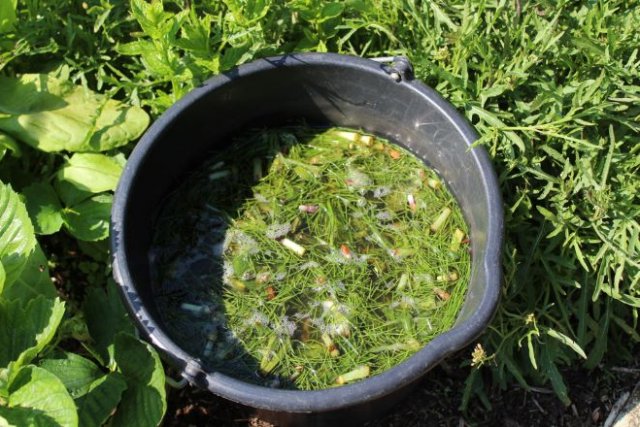 Приготовление слишком большого объема раствора – распространенная ошибка многих дачников. Кто-то опасается, что полезного состава не хватит на весь огород. Кто-то таким образом пытается задействовать всю лишнюю растительность, чтобы не выбрасывать. Кто-то машинально заполняет имеющуюся немаленькую емкость до верха. Так или иначе, готовить травяной раствор нужно с учетом количества ваших посадок, иначе вместо удовольствия от проделанной работы вы получите головную боль – куда деть излишки раствора, который достаточно скоро портится.