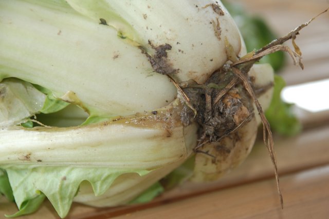 1. Заболевание начинается сверху, с кроющих листьев. Они становятся темными, покрываются маслянистыми пятнами, которые постепенно увеличиваются, захватывая весь лист. Появляется запах гнили. С течением времени заболевание распространяется на весь кочан, что в конце концов приводит к его порче.
