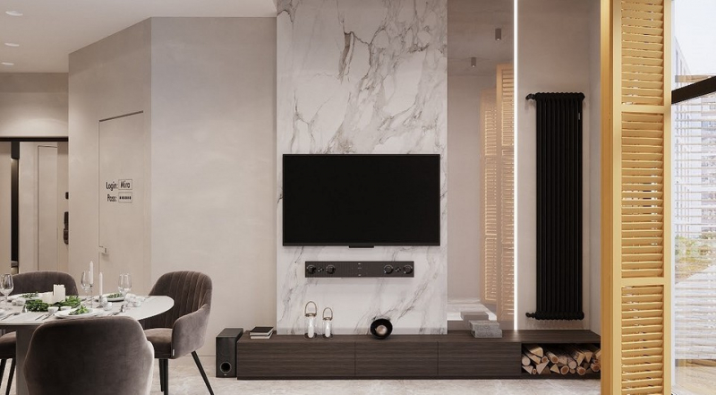«Я руководствуюсь принципом: не можешь скрыть выделяй. Подобные конструкции можно сделать акцентными за счет отделки. Зеркала позволяют визуально растворить выступающие элементы, увеличить пространство, добавить света. Эффектно работает подсветка. С двух сторон от монолитного пилона или в нише можно смонтировать светодиодную ленту, подчеркнув нестандартную геометрию стены», советует Евгения Астахова.