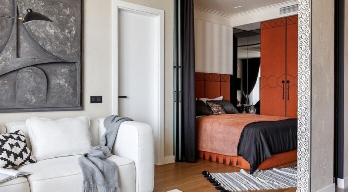 При входе выделили большой гардеробный шкаф и основную ванную комнату. Дальше общую кухню-гостиную, где кухонная зона занимает проходную часть. Одна из спален главная изолирована и расположена у окна. В ее блоке также есть своя гардеробная и небольшой санузел. Выделить вторую спальню было сложнее, но и это получилось. Небольшую комнату решили организовать по центру квартиры, отделив от кухни-гостиной стенами с раздвижной дверью-перегородкой из стекла. Так в спальню попадает естественный свет.