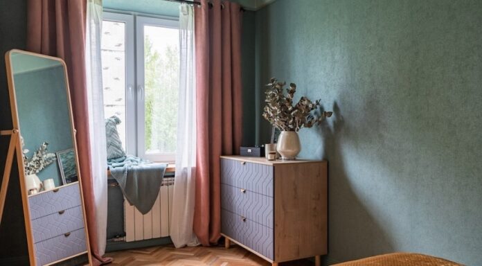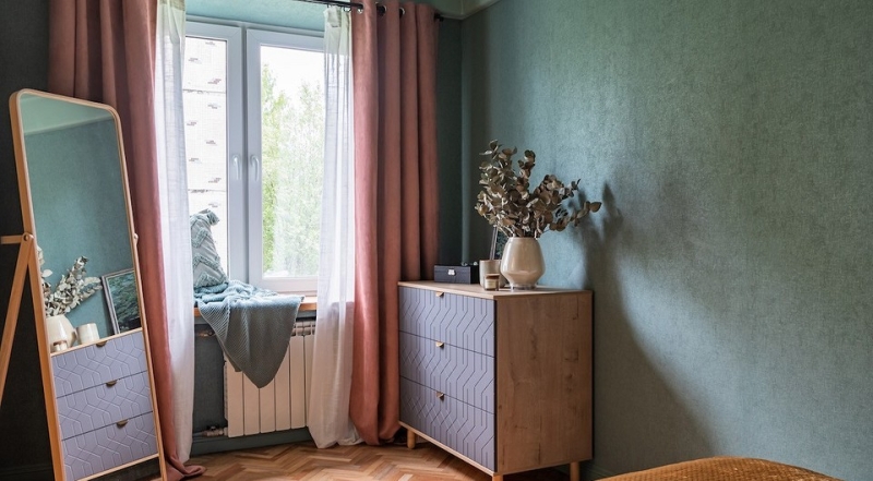 Эта квартира находится в Санкт-Петербурге, в доме типовой серии. Автор проекта дизайнер Полина Андреева оформляла ее для девушки, которая получила квартиру в наследство. Здесь две комнаты. Спальня маленькая и при этом достаточно узкая. Стены оклеили однотонными обоями глубокого бирюзового цвета, а в изголовье кровати сделали акцентную стену обои того же оттенка, но с различимым рисунком. Интересный ход покраска потолка в тот же бирюзовый, но на несколько тонов светлее. Краска также «зашла» на стены по периметру этот ход позволил визуально сделать потолок чуть выше.