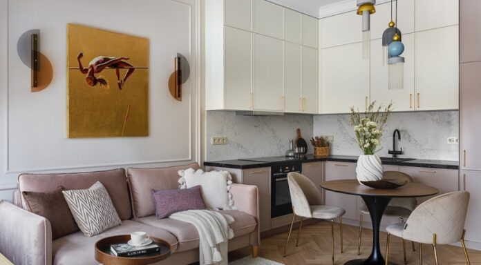 Владелица этой квартиры любит готовить и проводить дегустации для своих друзей. На небольшой площади квартиры предстояло обустроить достаточно места для этого. И, конечно, оформить удобную и комфортную приватную зону.